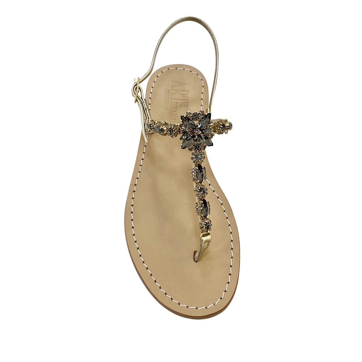 Women’s Jewel Sandals “Sole” in Platino Calf Leather with Smoke Stones – Authentic Handmade in Italy Sorrento Craftsmanship
