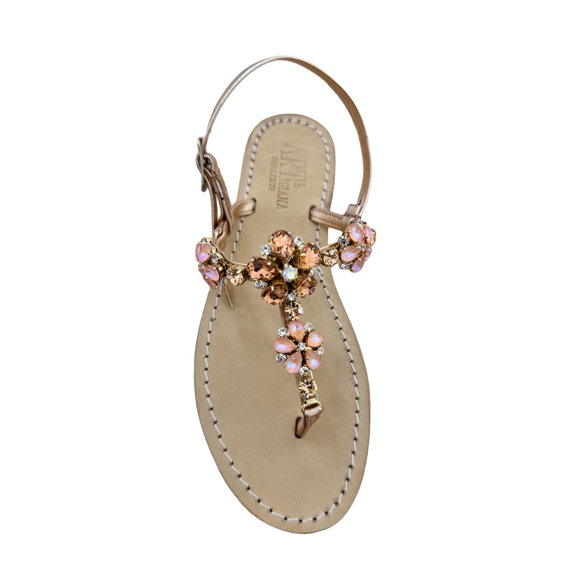 Crafted with artisanal dedication in our Sorrento workshop, the Fiorella model finds its most poetic expression in Rose Gold. The metallic rose gold calfskin wraps the foot in softness, while the full decoration with crystals in the same shades creates a "tone-on-tone" effect of absolute prestige. Light is not just reflected but amplified by the warmth of the metal and stones.