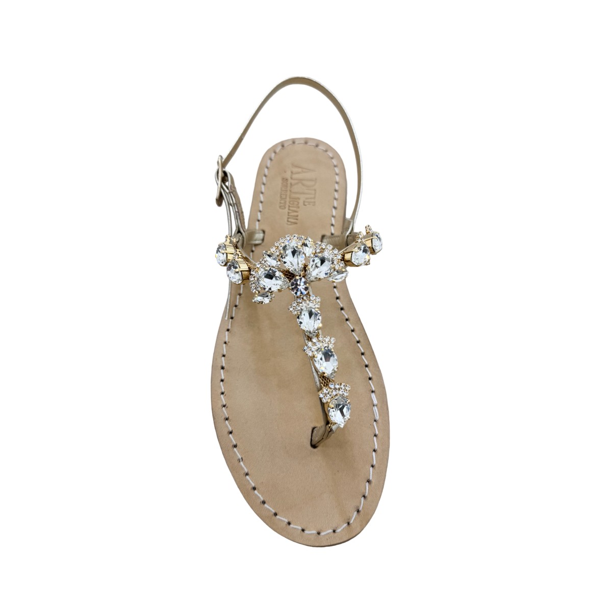 Crafted with dedication in our Sorrento workshop, the Flavia model in the platinum and clear crystal version represents the perfect synthesis of tradition and splendor. The platinum calfskin, with its warm and refined metallic reflections, sets the stage for a cascade of high-refraction crystals, meticulously hand-applied along the central strap.