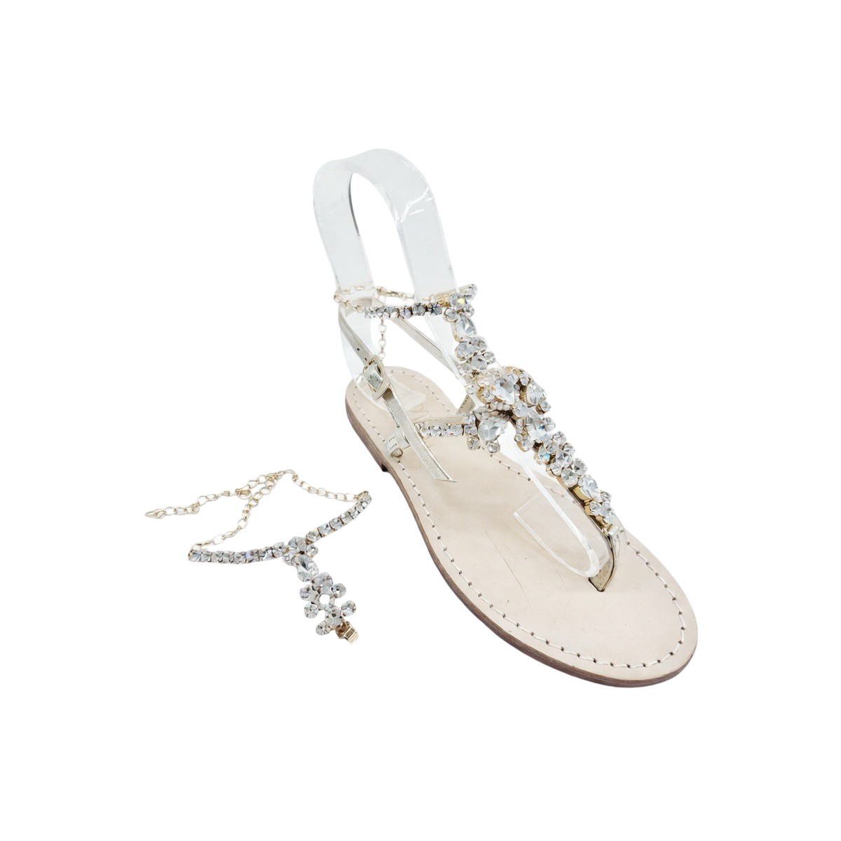 Add to cart your handmade in Italy Sorrento women’s “Elena” jewel sandals gold calf with transparent crystals and experience the pleasure of a unique sandal on your feet.