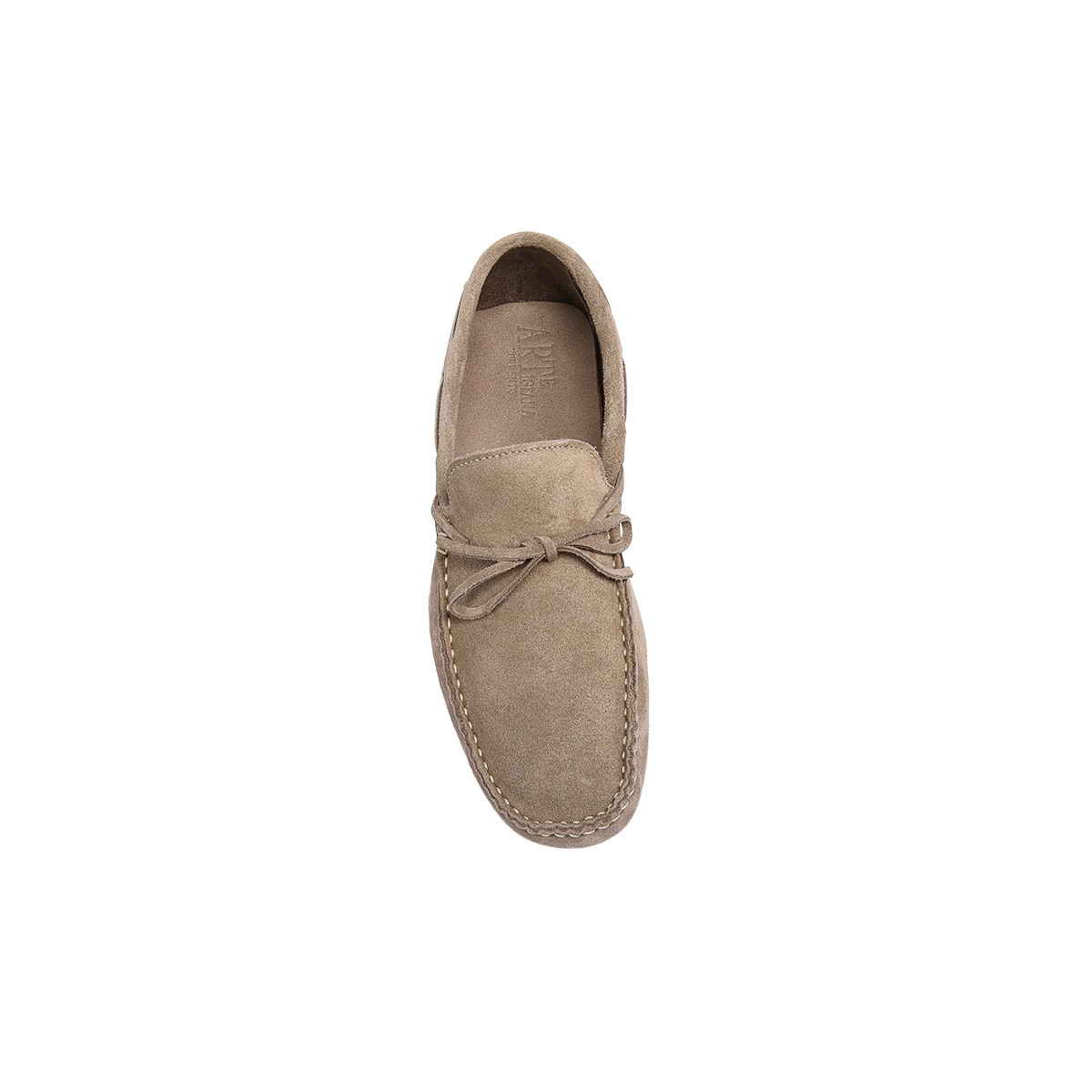 The design features a wraparound leather lace, a classic stylistic element that defines the high-end driving loafer silhouette. The technical heart of the shoe is the pebble sole (driving sole), where each rubber stud is manually inserted and secured by our craftsmen. The premium beige suede provides a natural glow, making it the most sophisticated choice for the modern gentleman's summer and leisure wardrobe.