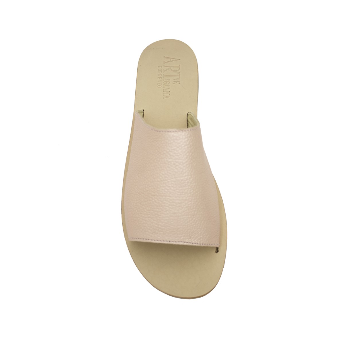 Our single band "Slipper" in Rose Gold is a true piece of wearable jewelry. Every pair is made by us, reflecting the artisanal heritage of our own workshops and stores in Sorrento. The hammered leather texture enhances the copper-pink reflections of this shade, creating a shimmer that beautifully catches the Mediterranean light.