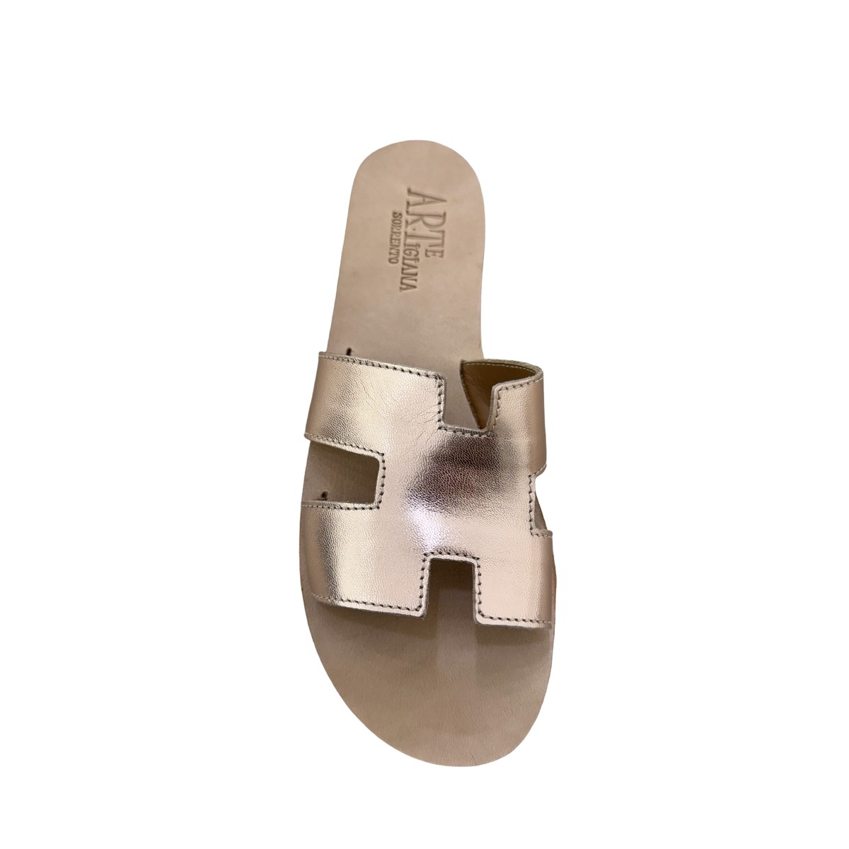 The rose gold calfskin Pantofola H model elevates the concept of the daily slide into a gala-ready footwear choice. Every pair is made by us in our Sorrento workshops, where the calf leather is treated with a high-excellence metallic finish. Rose Gold is the perfect nuance for those seeking a modern alternative to classic gold or silver, offering a warmer reflection that caresses the skin.