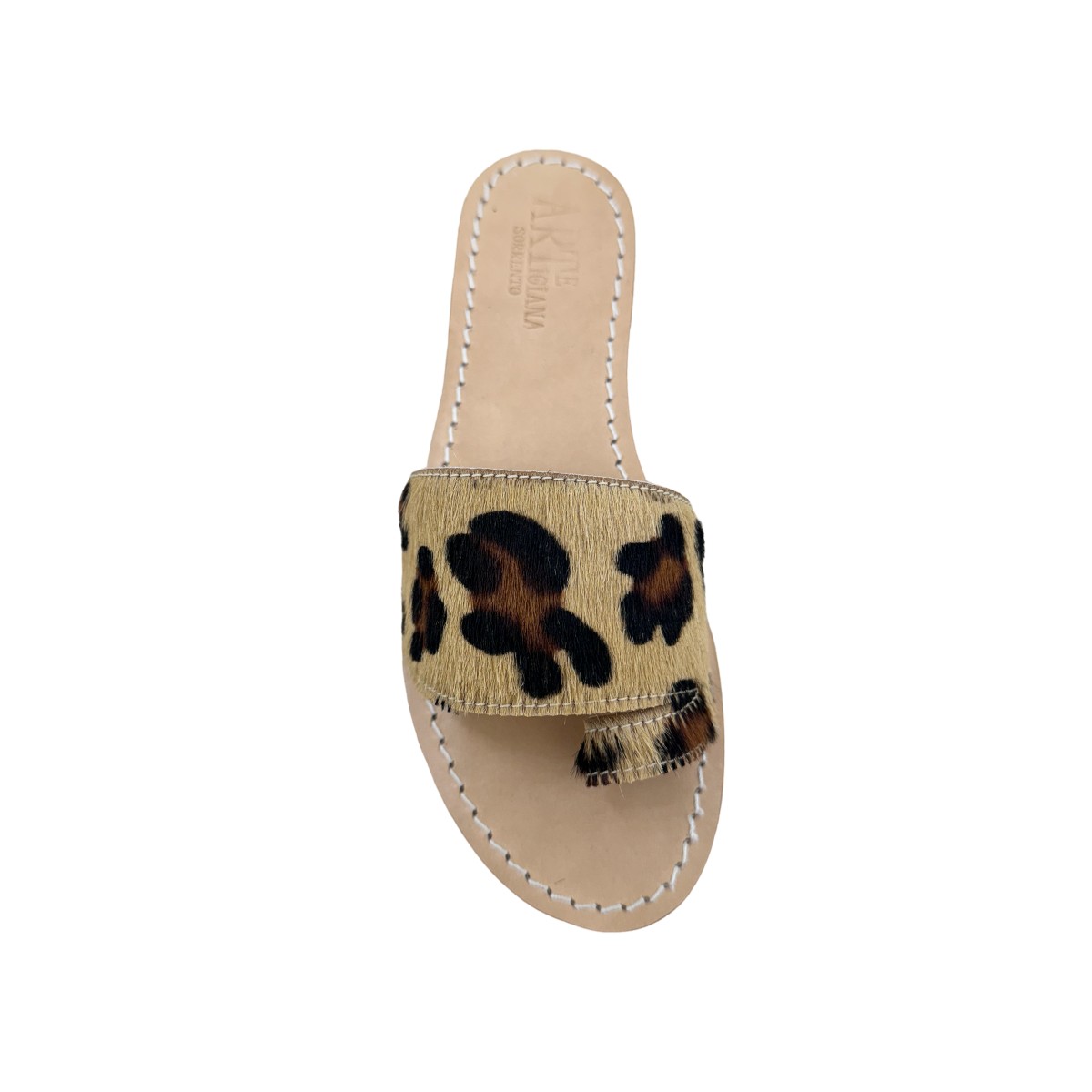 Our leopard-print calf hair thong sandal is a statement of uncompromising style. Every pair is made by us, reflecting the artisanal heritage of our own workshops and stores in Sorrento. The natural texture of the calf hair, combined with the timeless leopard motif, provides a visual and tactile depth that only high-end craftsmanship can achieve.