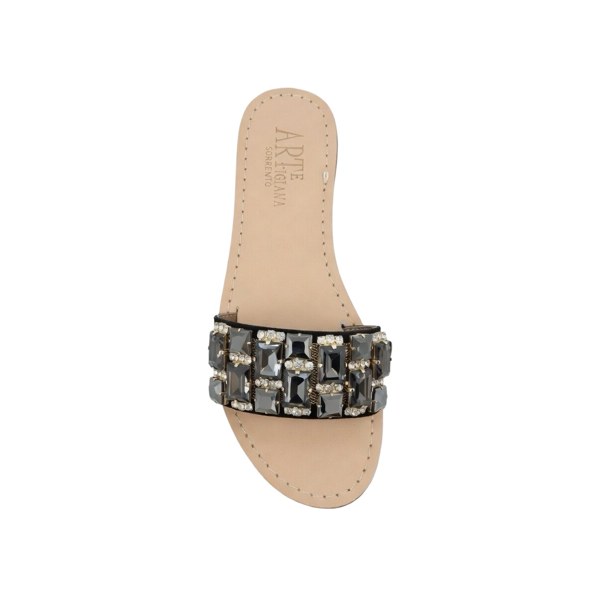 Aggiungi al carrello i tuoi Sandali gioiello “Kia” camoscio nero con cristalli neri artigianali fatti in Italia Sorrento e prova il piacere di un sandalo unico al piede.