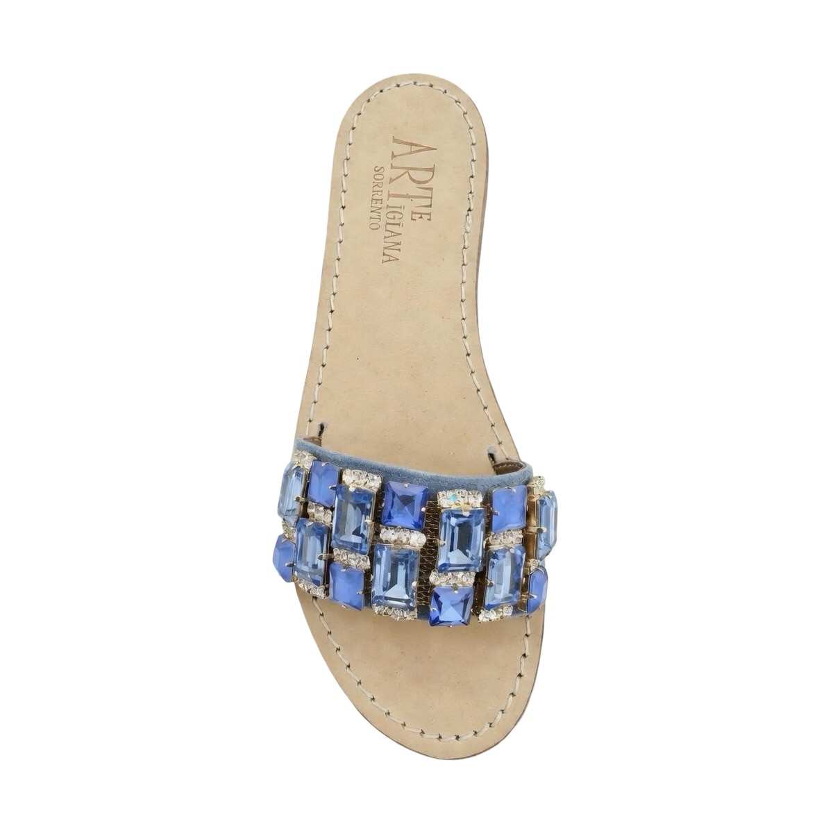 Ideali per la donna moderna che cerca sandali gioiello “Kia” da donna in camoscio jeans con cristalli jeans di altissima qualità, fatti a mano in Italia a Sorrento, morbidissimi, traspiranti e perfetti da indossare in ogni stagione.