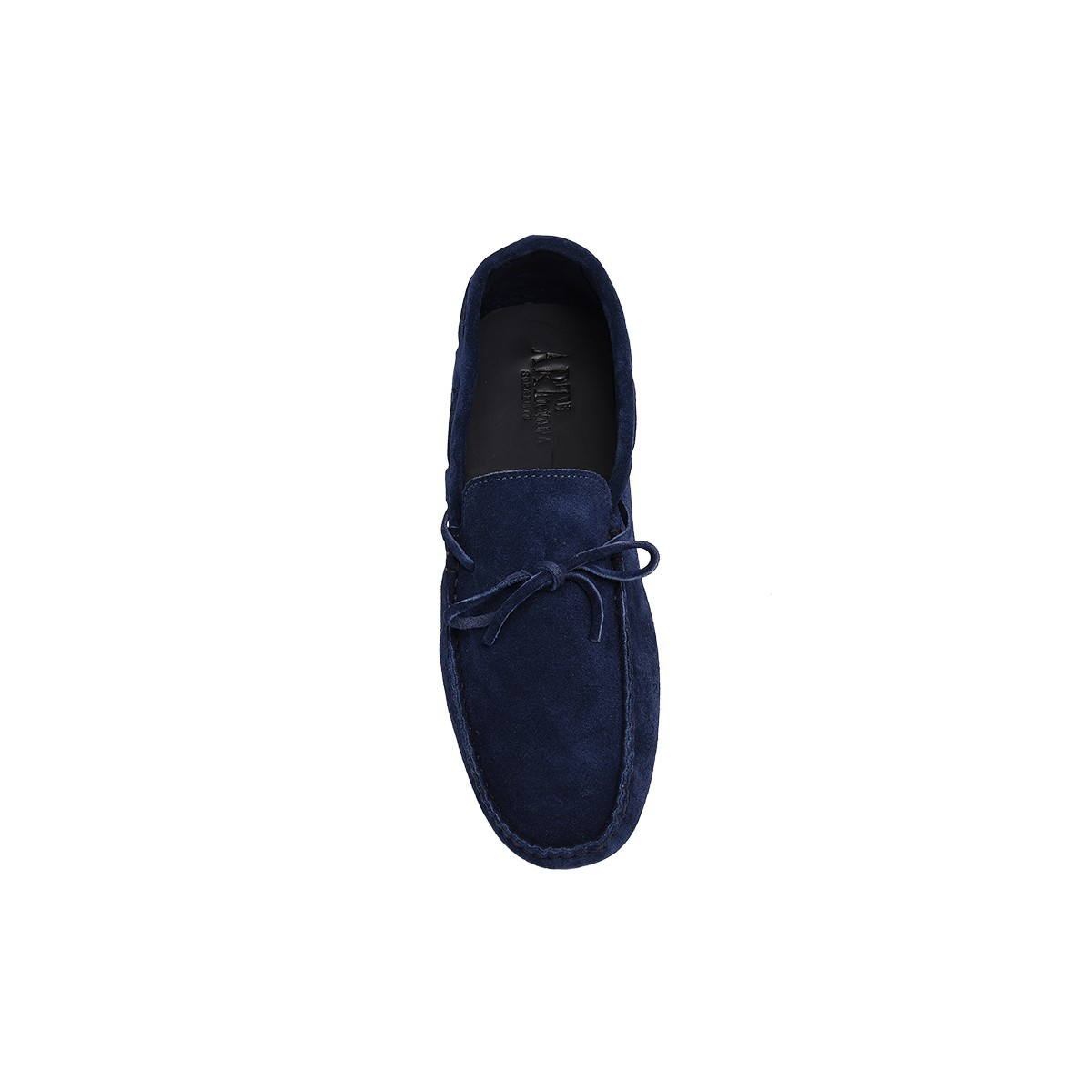 Il design è impreziosito dal laccetto perimetrale in pelle, un elemento distintivo che conferisce al mocassino il classico carattere della calzatura da guida d'élite. Il cuore tecnico rimane la suola a gommini (driving sole): ogni singolo tassello in gomma viene inserito e fissato da noi manualmente attraverso una meticolosa cucitura a mano. La profondità cromatica del camoscio blu navy di prima scelta rende questa calzatura l'accessorio definitivo per l'uomo che cerca distinzione e comfort estremo.