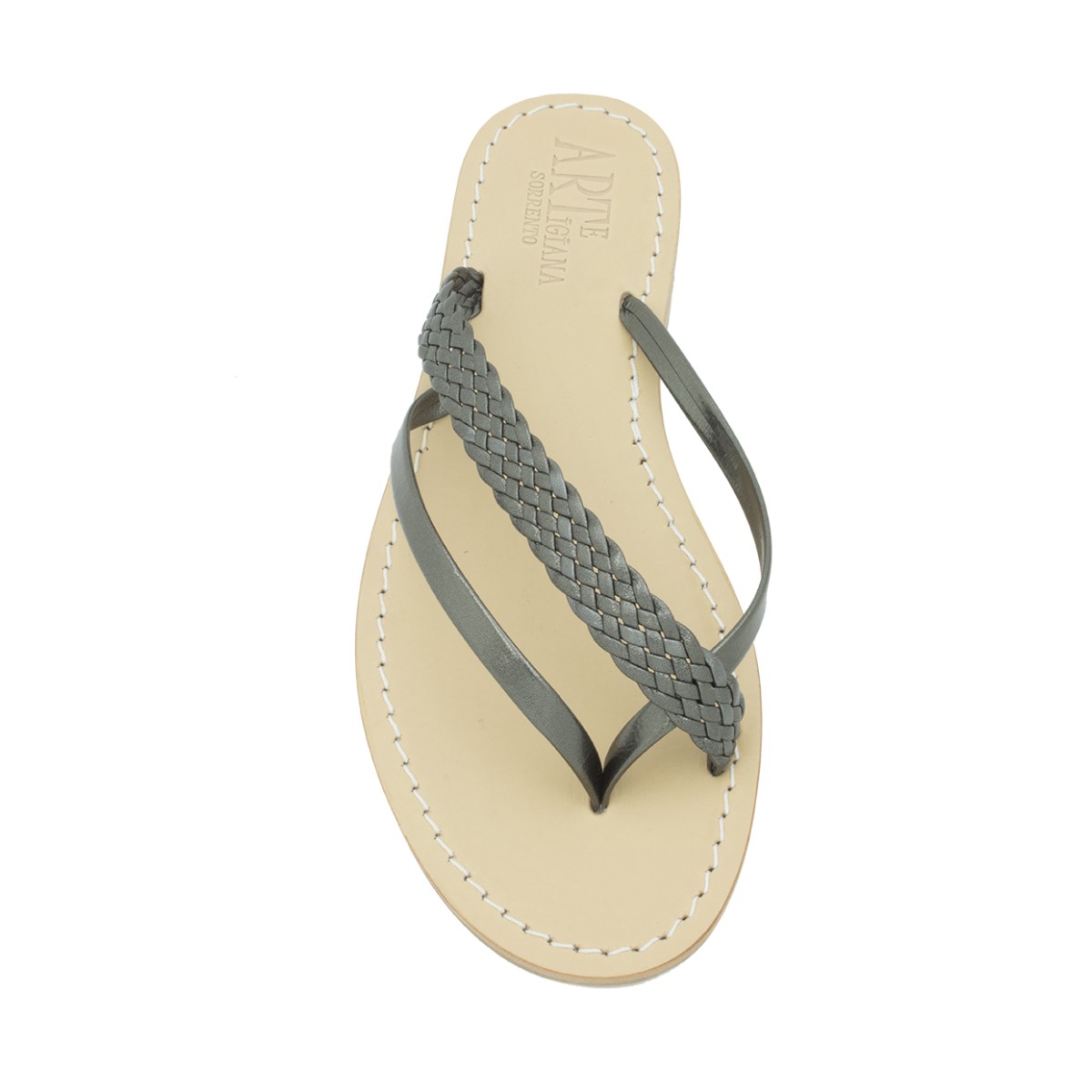 Il sandalo infradito a treccia nella variante color fumo rappresenta una scelta di stile sobria e di grande classe. Ogni paio è prodotto direttamente da noi, con la passione e l'esperienza che caratterizzano i nostri laboratori e negozi di Sorrento. Un accessorio versatile, pensato per chi ama l'eleganza dei toni neutri ma decisi.