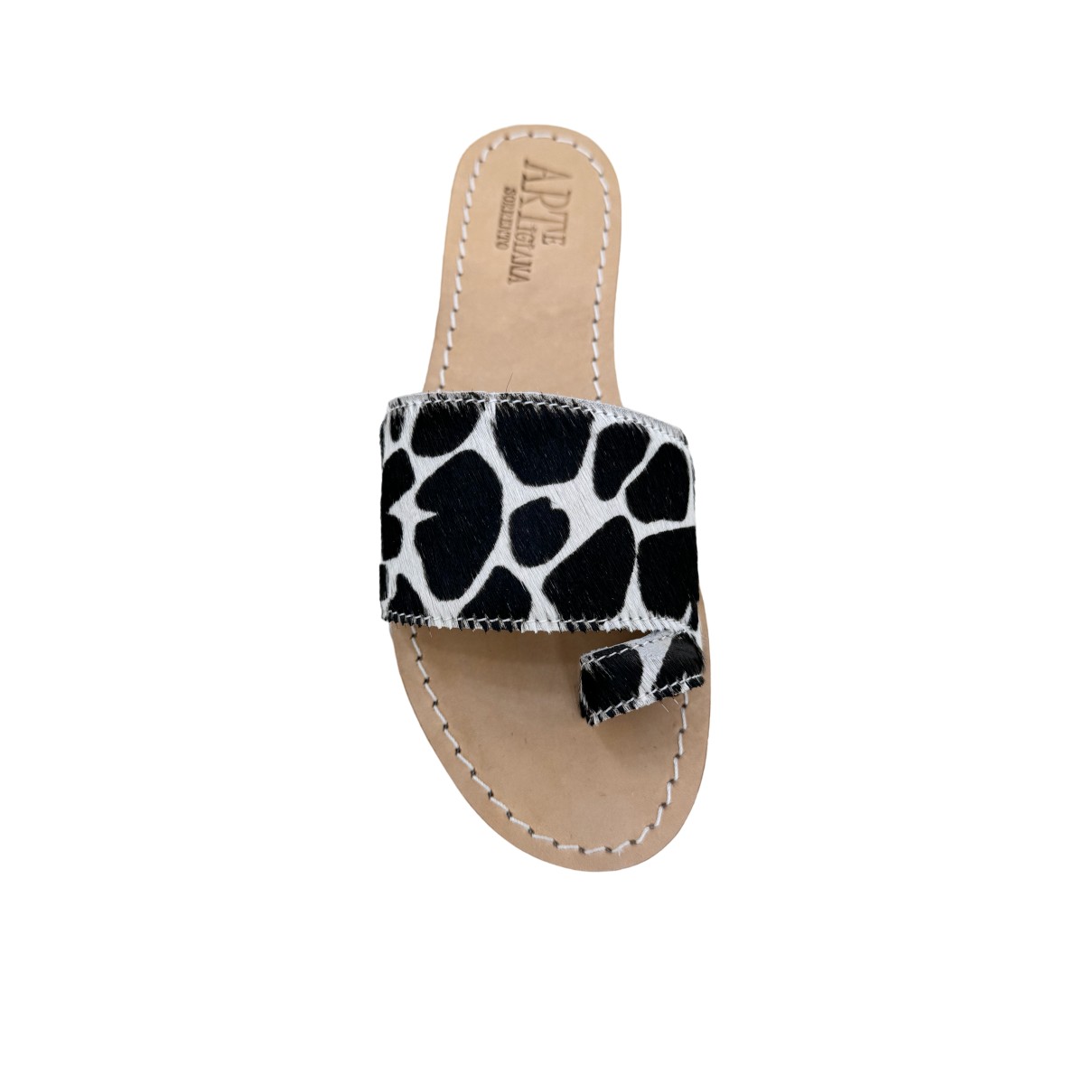 Il nostro sandalo infradito in cavallino bianco e nero è un esercizio di stile e precisione. Ogni paio è prodotto direttamente da noi, seguendo i dettami della tradizione dei nostri laboratori e negozi di Sorrento. La texture naturale del pelo di vitello (cavallino) esalta il gioco cromatico "optical", creando una calzatura che è al tempo stesso un accessorio di design e un capolavoro di artigianalità.