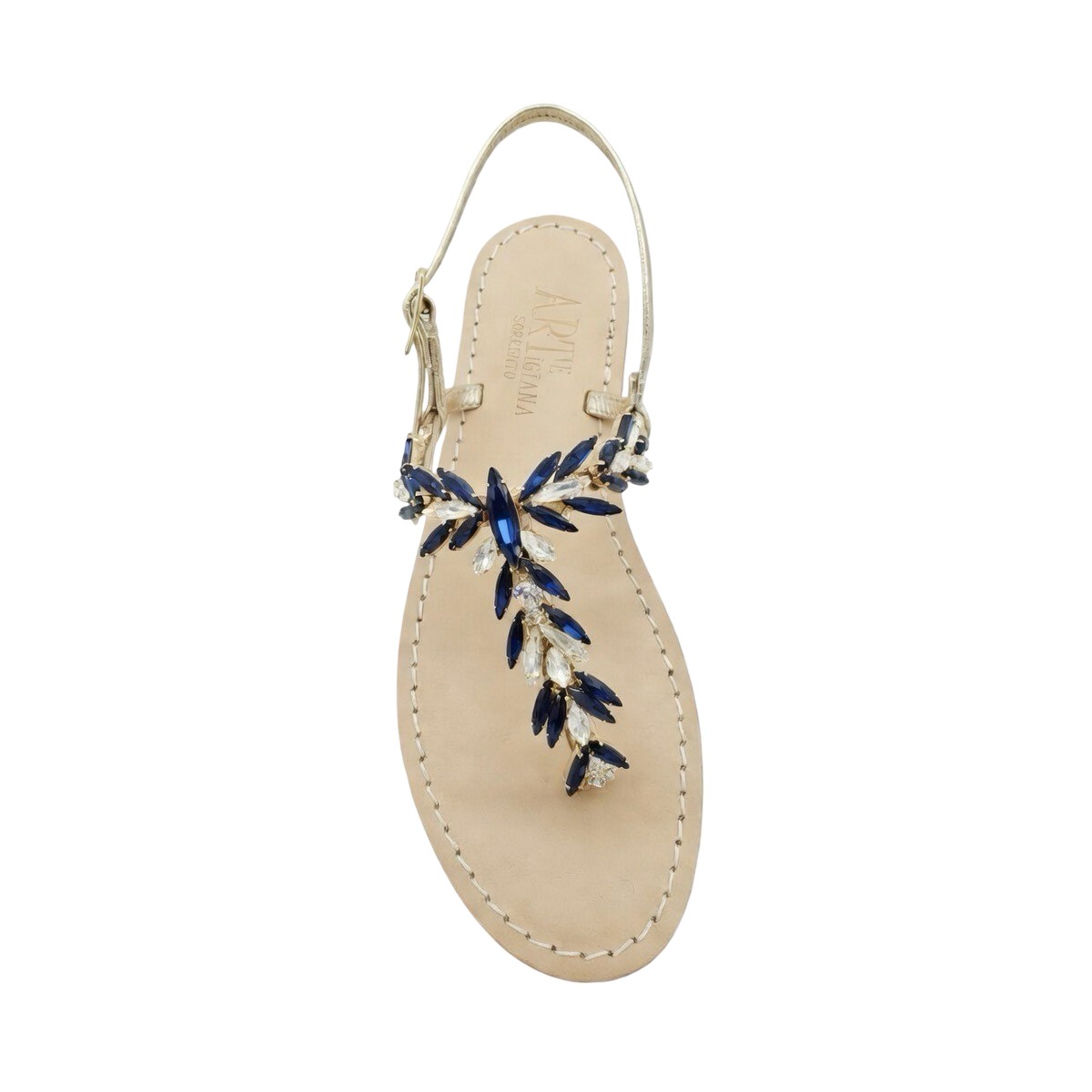 Aggiungi al carrello i tuoi Sandali gioiello “Mia” vitello platino con cristalli blu e trasparenti artigianali fatti in Italia Sorrento e prova il piacere di un sandalo unico al piede.