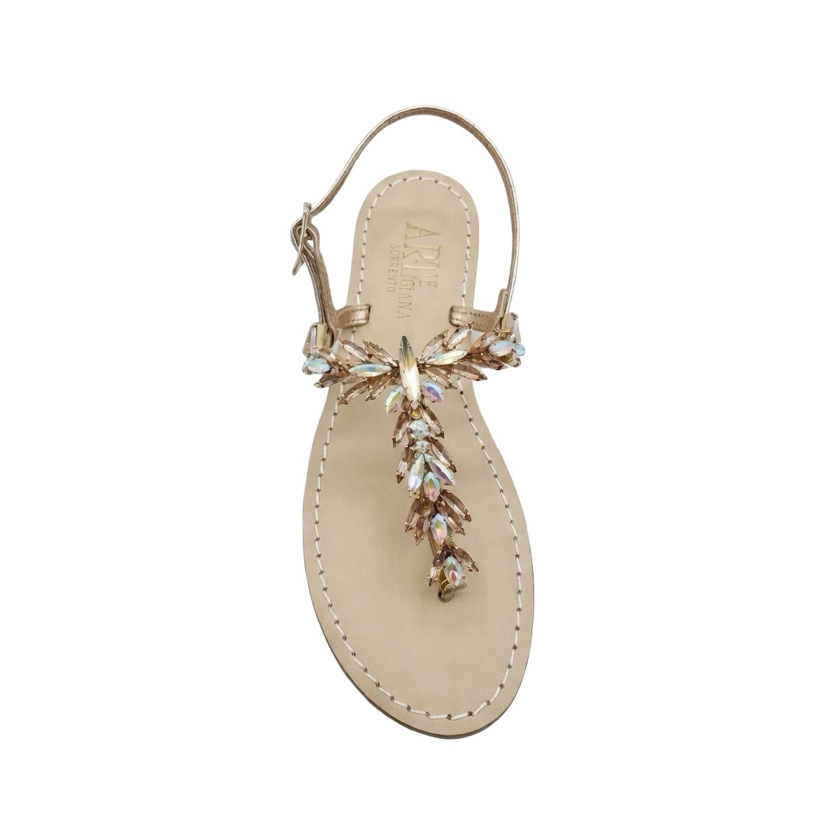 Realizzati totalmente a mano nei nostri laboratori e negozi di Sorrento sulla Costiera Amalfitana, i sandali gioiello “Mia” da donna sono un modello raffinato e luminoso, espressione pura della tradizione artigianale italiana con un tocco di eleganza preziosa, ispirata alle iconiche creazioni di Capri e Positano.